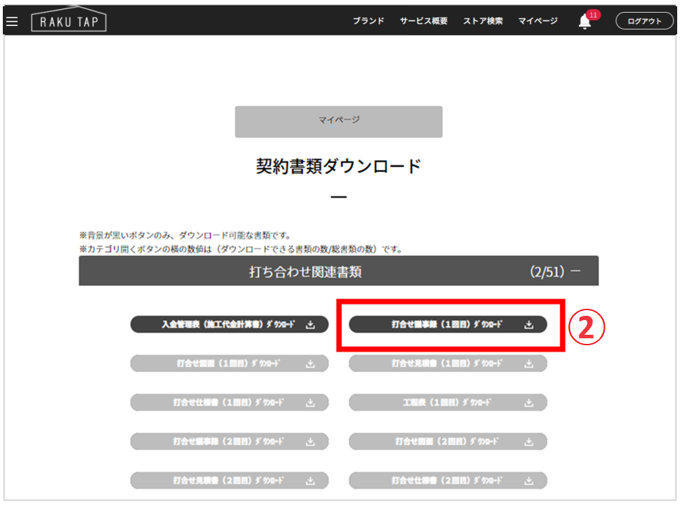 - ※管理側でアップロードされた書類はボタンの色が黒くなりダウンロードすることができます。