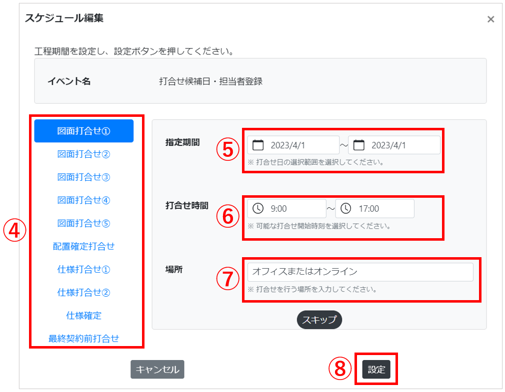 - 設定をクリックすると入力された全ての打合せの候補日を設定します。