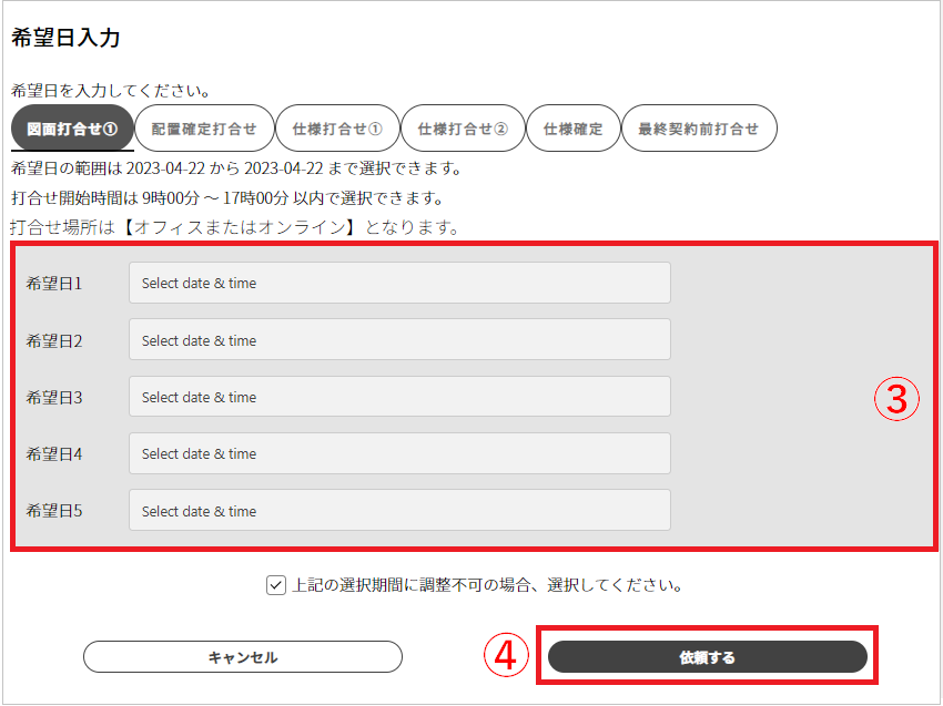 - 施主側で候補日の調整ができない場合、再度希望日を設定する必要があります。希望日を入力し、設定をクリックしてください。