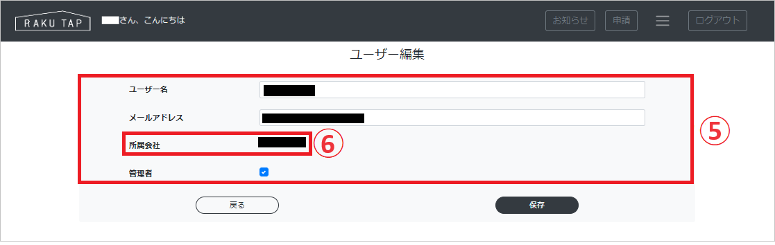 - 所属会社には、ログインしているユーザーの所属している会社が自動的に入力されます。変更することはできません。